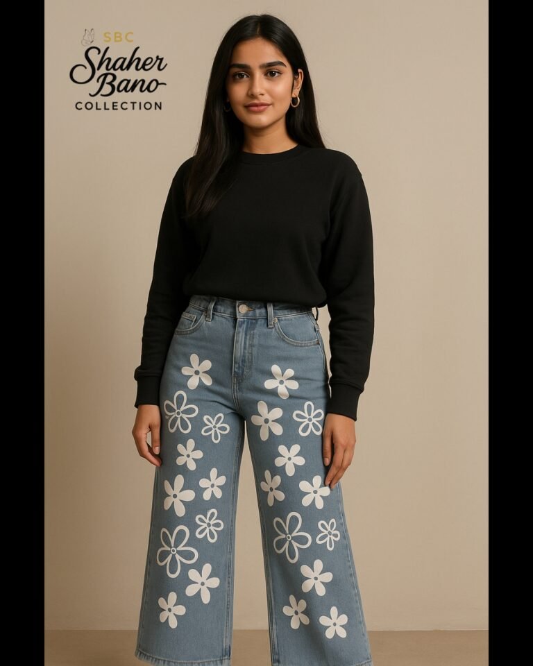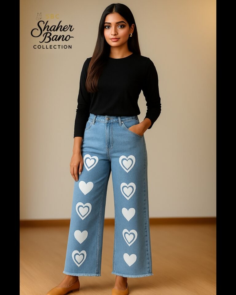 Blue Heart Bloom Print Wide-Leg Flapper Denim Jeans