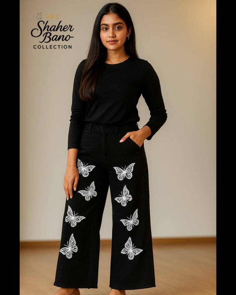 Black Butterfly Print Wide-Leg Flapper Denim Jeans
